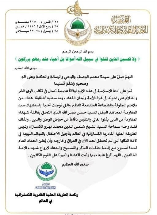 ئەوەی براکانمان لەوێ لەڕووی داستانی قارەمانێتی و ئازایەتی بێهاوتایەوە نیشانیان داوە، دواجار بە تێرۆرکردنی سەید المراق، موجاهید، سەید حەسەن نەسروڵڵا، کە پەیوەست بوون بە کاروانی قۆربانیانی بەرخۆدان، هاوشانی ئەوانەی کە گیان و ماڵی خۆیان لەدەست دا لە بەرگریکردن لە نیشتمان و ئایین. بۆیە حەزرەتی سەید شێخ شەمسەدین محمد نەهرو کەسنەزانی بەرپرسی تەریقەتی قادری کەسنەزانیی لە جیهاندا فەرمانی دا کە ئاهەنگی مەولوود نەبەوی لە هەموو ئەو تەکایە دوابخرێت کە تا ئێستا ئاهەنگی میلاد نەبەوییان نەگێڕاوە. لە عێراق و دەرەوەی عێراق ماتەمینی گشتی ڕایانگەیاند بۆ ماوەی هەفتەیەک بەڕێوەبچێت و بازنەی زیکر و تەسبیح و نوێژ بۆ گیانی پاکی شەهیدانی نەمری میللەت دابمەزرێت.